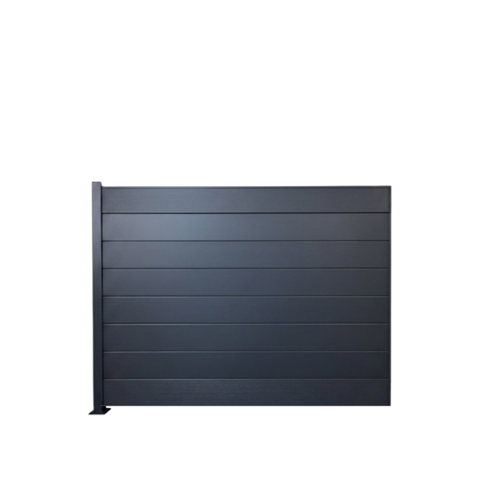 Cet ensemble comprend un poteau, une platine de fixation, la visserie adaptée, les profils supérieur et inférieur, ainsi que les lames pleine de clôture aluminium. Produit en Europe, répondant aux exigences CE et bénéficiant d’une finition thermolaquée gris anthracite.